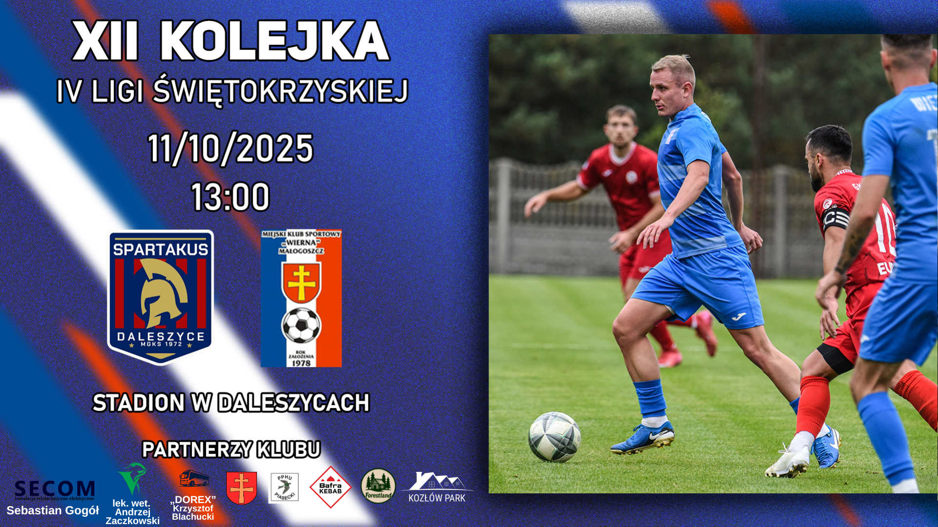 W 12. kolejce KEEZA 4. Ligi Świętokrzyskiej Wierna Małogoszcz rozegra wyjazdowe spotkanie ze Spartakusem Daleszyce. Mecz rozpocznie się w sobotę (11.10) o godzinie 13:00. W ...