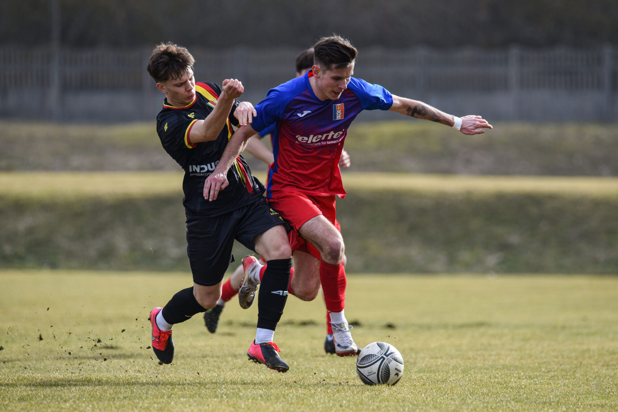 Od początku spotkania obie drużyny próbowały narzucić swój styl gry, jednak w pierwszych minutach sporo było walki w środku pola i niedokładności. Goście częściej utrzymywali się przy piłce, a nasza drużyna szukała swoich szans głównie w kontratakach, które kilkukrotnie pozwoliły nam podejść pod bramkę rywali i stworzyć groźne sytuacje. W 21. minucie sędzia podyktował rzut karny dla gości, jednak świetną interwencją popisał się Szymon Spurek, który obronił jedenastkę i utrzymał wynik 0:0. W kolejnych minutach gra była bardzo szarpana, a więcej akcji toczyło się pod naszą bramką. Nasza defensywa spisywała się jednak bardzo pewnie, a my próbowaliśmy odpowiadać szybkimi kontrami. W 40. minucie po jednej z akcji przewrotką próbował zaskoczyć bramkarza Wiktor Stojko, a chwilę później po przejęciu piłki swoich sił spróbował również Velentyn Fedoruk. Żadna z tych sytuacji nie zakończyła się jednak bramką. Gdy wydawało się, że do przerwy utrzyma się bezbramkowy remis, w ostatniej minucie pierwszej połowy goście zdobyli gola po rzucie rożnym i zamieszaniu w polu karnym. Do szatni schodziliśmy przy wyniku 0:1.